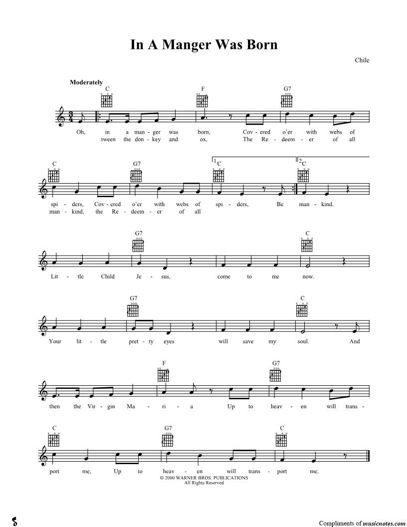 Oh, in a manger was born, Covered o'er with webs of spiders, Covered o'er with webs of spiders, Be mankind. |