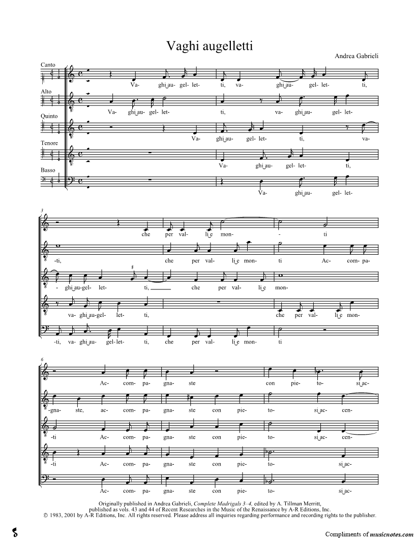 Vaghi augelletti, che per valli e monti Accompagnaste con pietosi accenti I miei duri lamenti, Gioite hor meco in festa et allegrezza, Poi che l'aspra durezza Della mia Chlori |