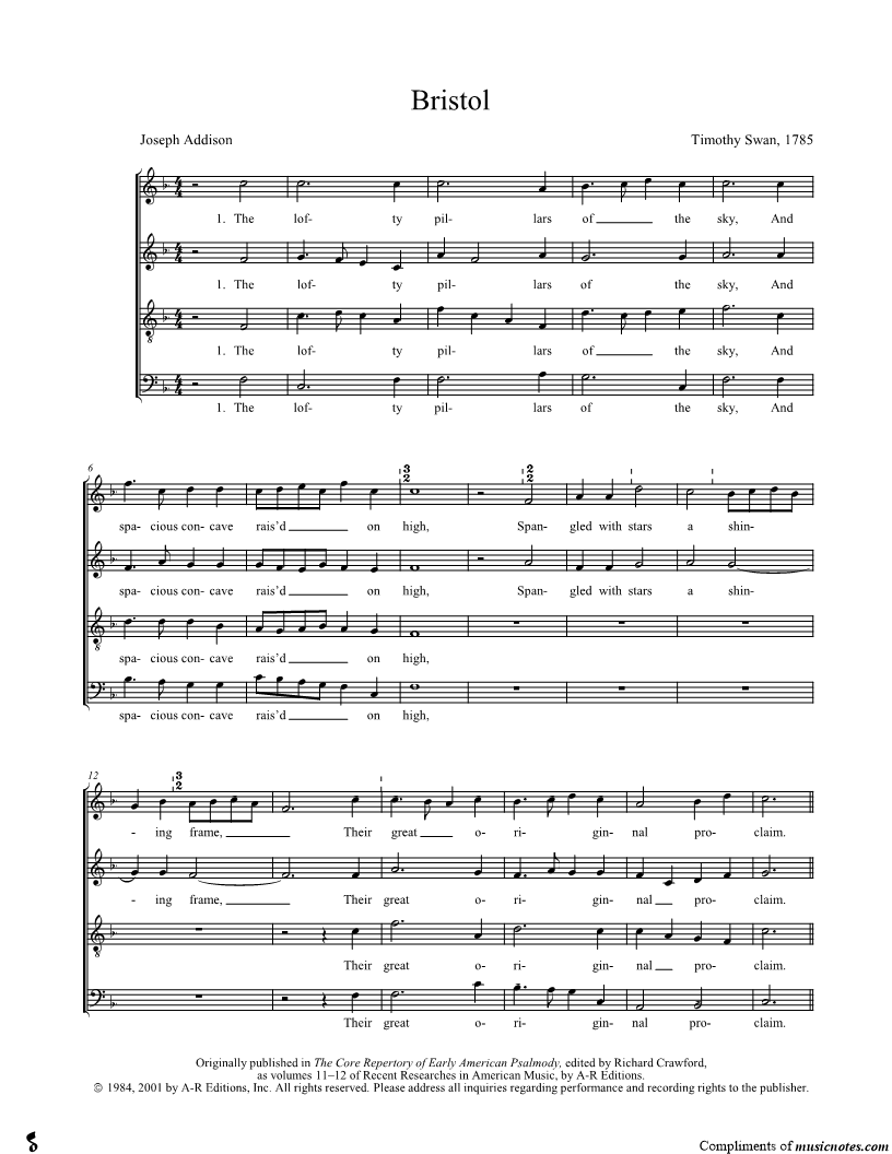 The lofty pillars of the sky, And spacious concave rais'd on high, Spangled with stars a shining frame, Their great originnal proclaim. |