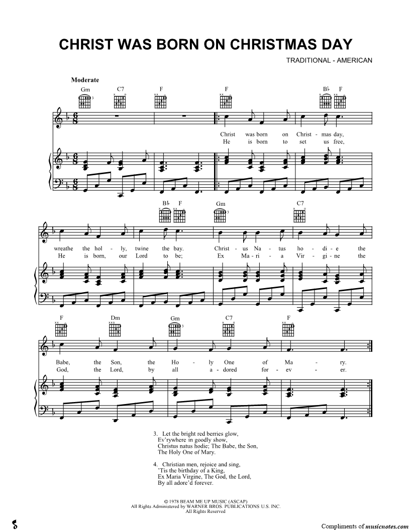Christ was born on Christmas day, wreathe the holly, twine the bay. |