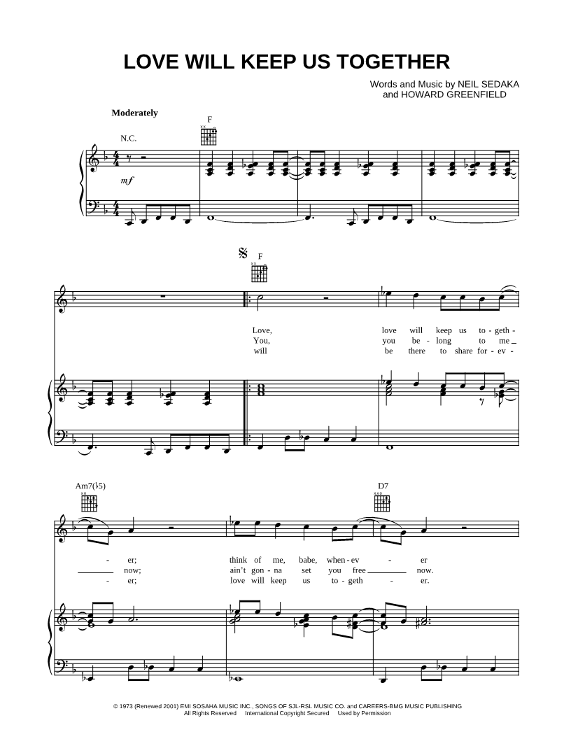 Love, love will keep us together; think of me, babe, whenever some sweet talkin' guy comes along, singin' his song. |
