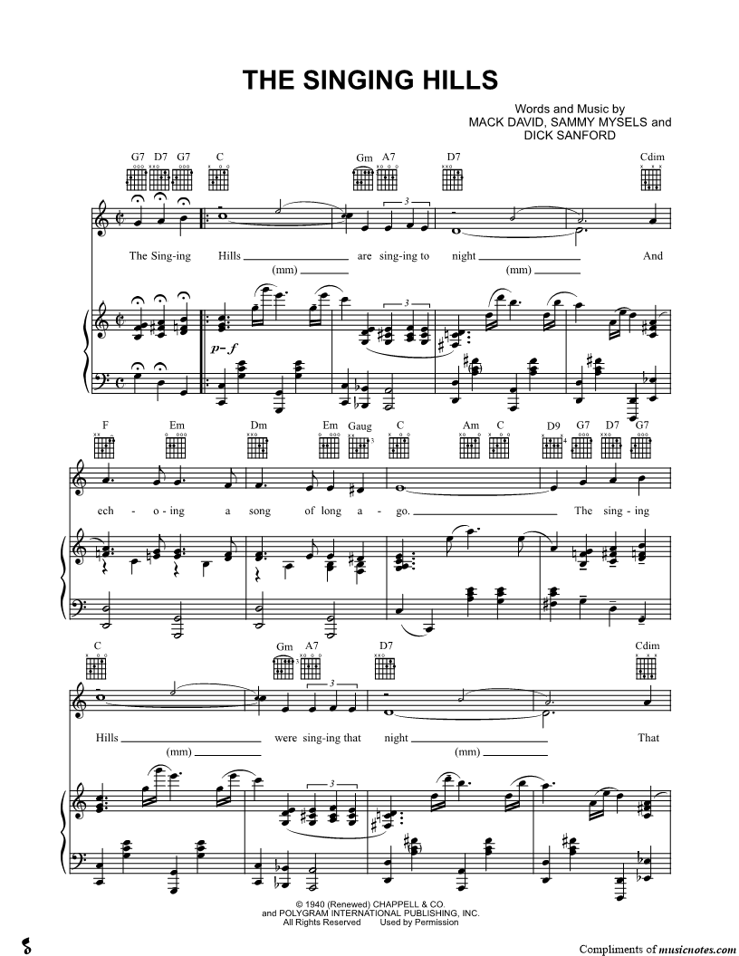 The Singing Hills are singing tonight And echoing a song of a long ago. |