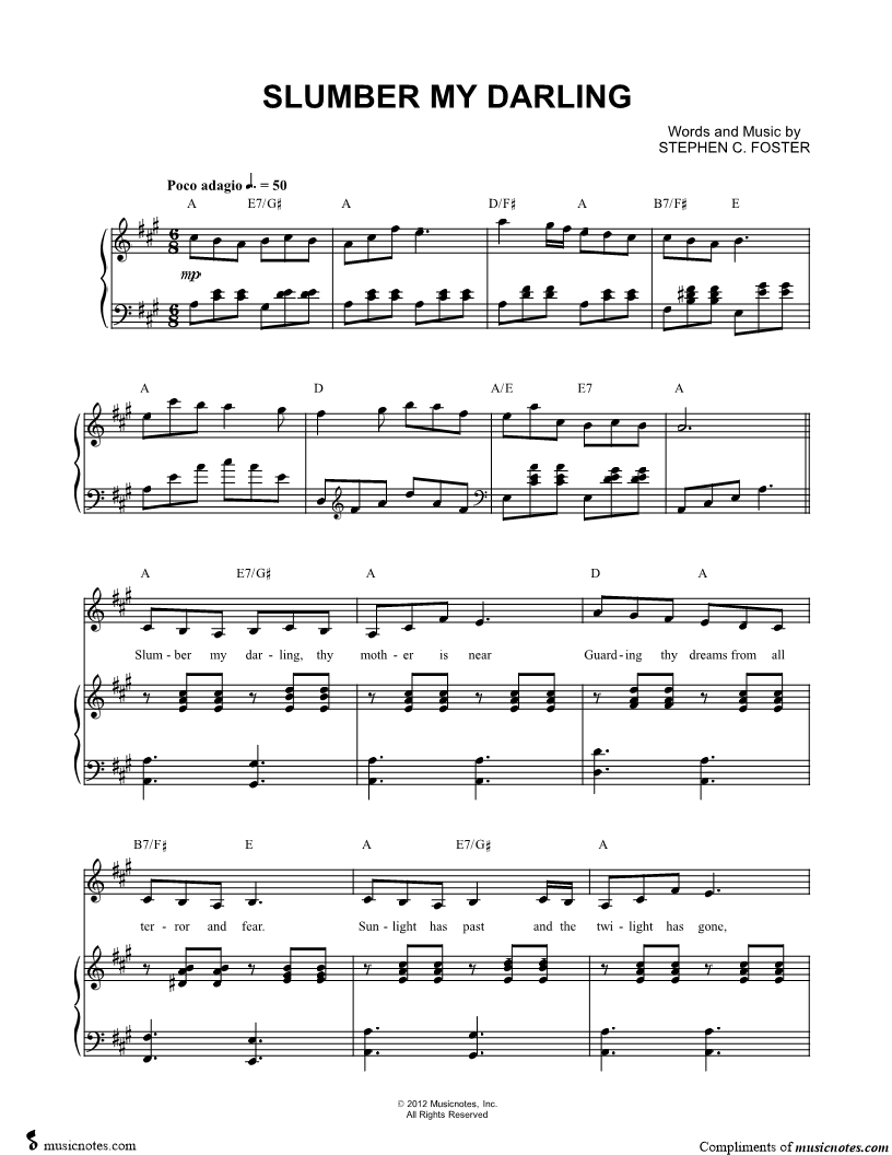 Slumber my darling, thy mother is near Guarding thy dreams from all terror and fear. |