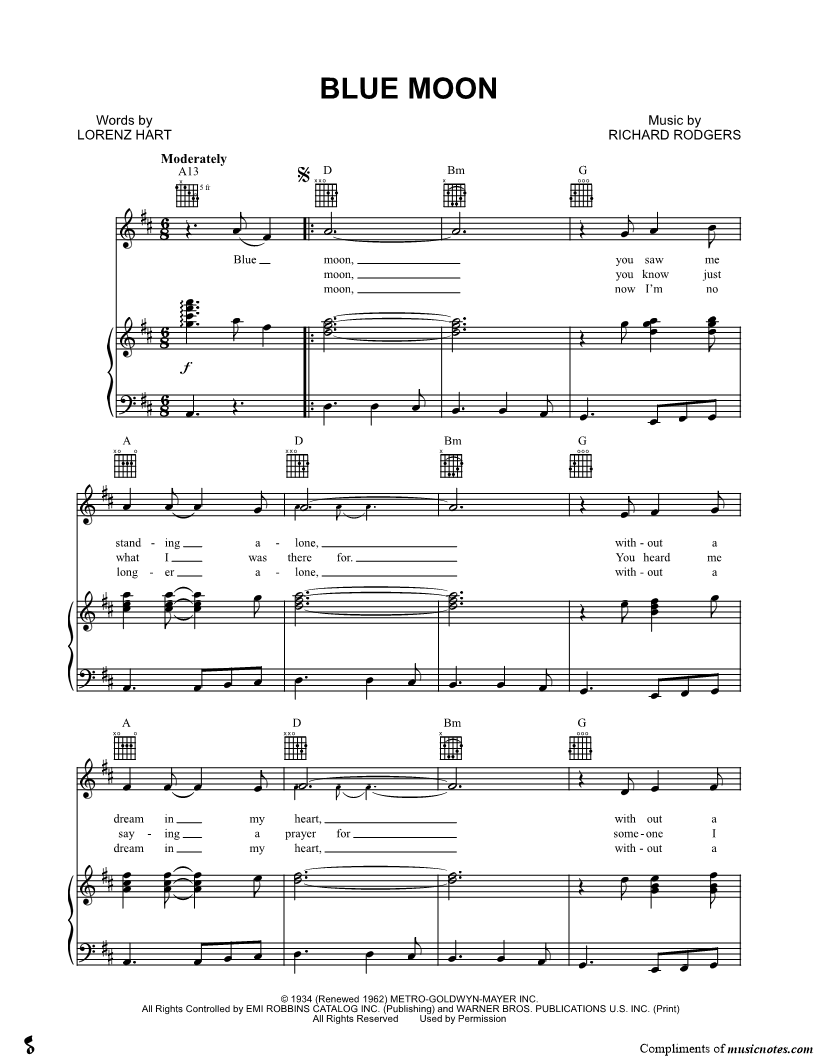 Blue moon, you saw me standing alone, with out a dream in my heart, with out a love of my own. |