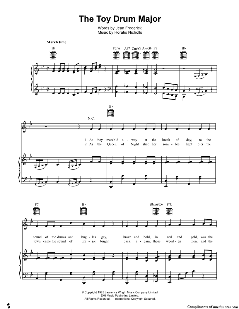 As they march'd away at the break of day, to the sound of the drums and bugles gay, brave and bold, in red and gold, was the toy drum Major. |