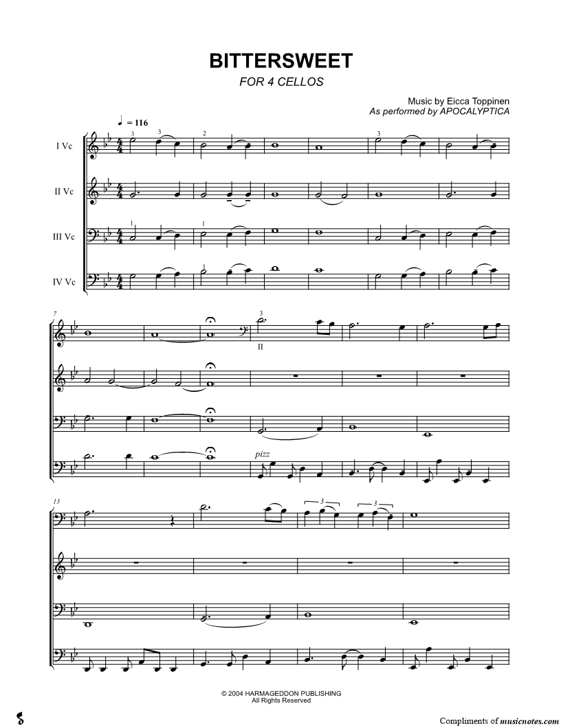 Cello 1, range: B2-Eb5 Cello 2, range: F3-D5 Cello 3, range: C2-G3 Cello 4, range: C2-F4 | |