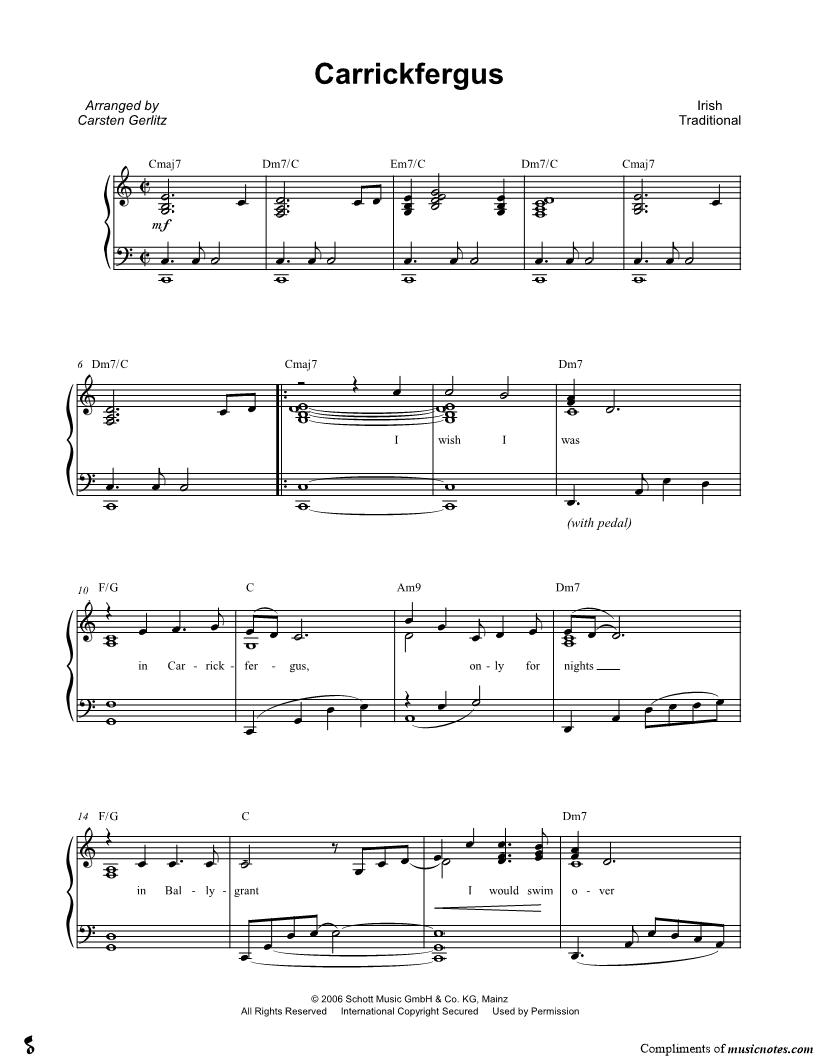 I wish I was in Carrickfergus, only for nights in Ballygrant I would swim over the deepest ocean, only for nights in Ballygrant. |