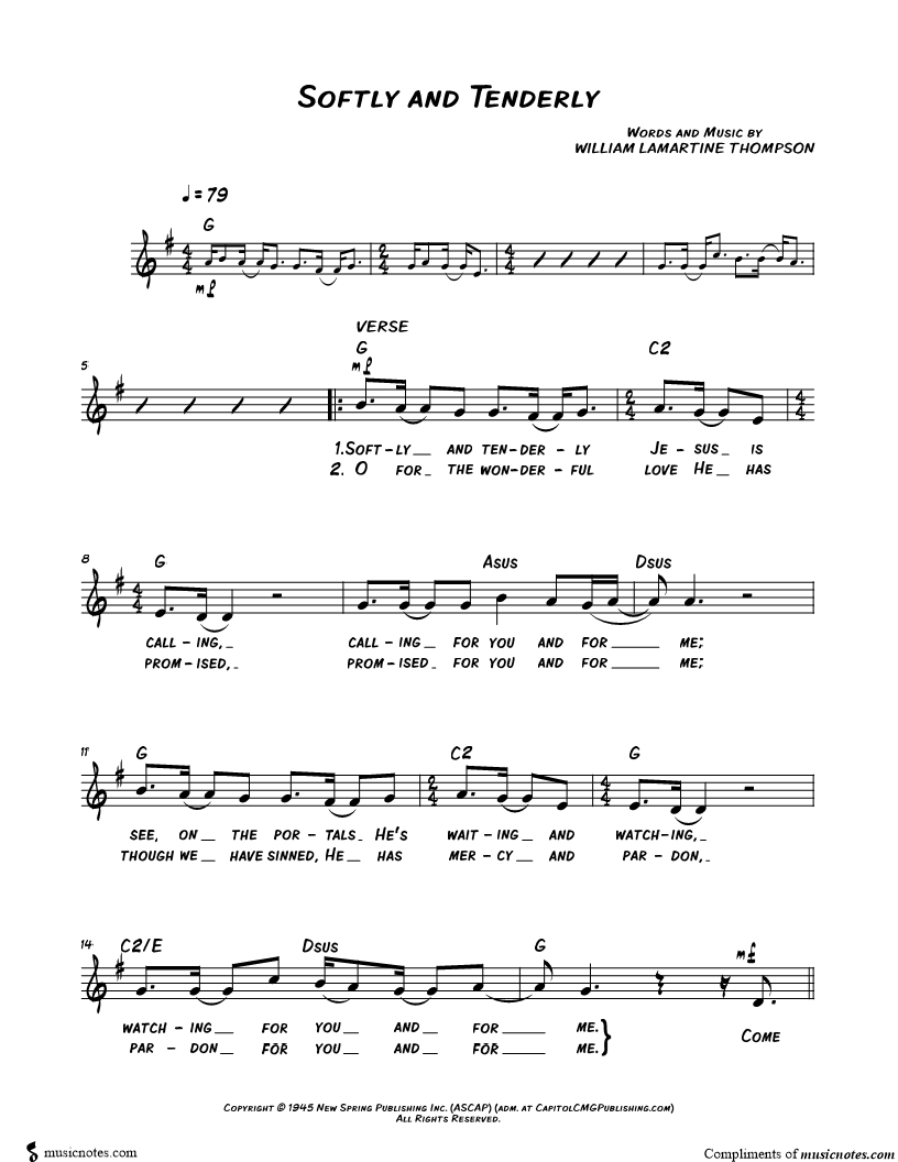 Softly and tenderly Jesus is calling, calling for you and for me; see, on the portals He's waiting and watching, watching for you and for me. |