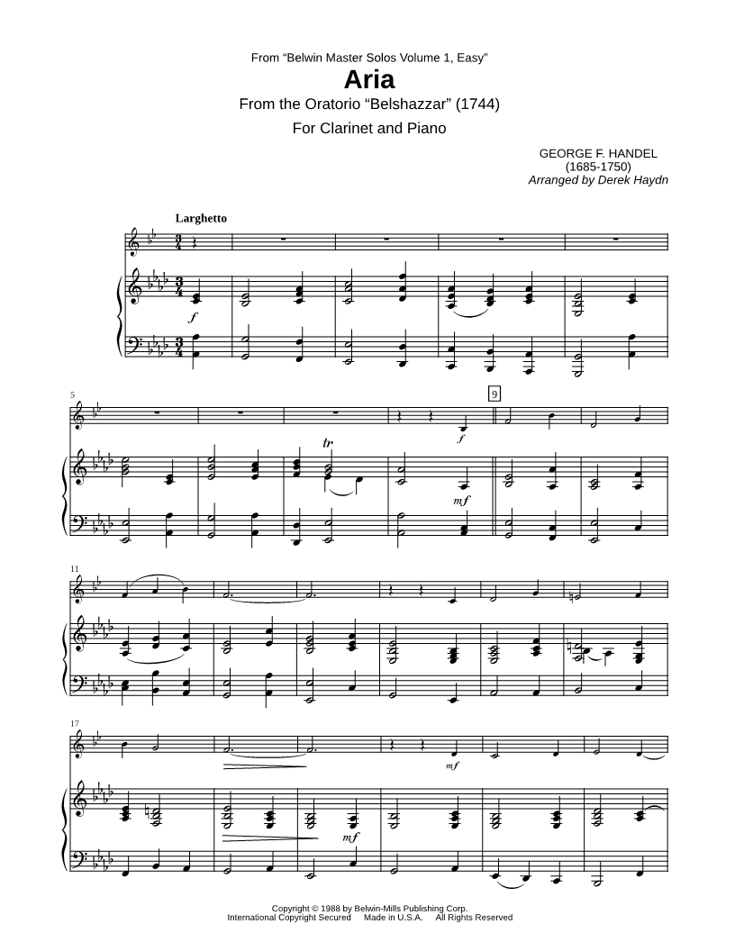 Aria from Belshazzar - Clarinet & Piano (from Belwin Master Solos Volume 1, Easy)