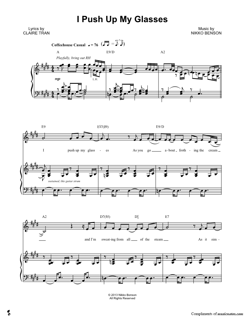 Musicnotes sells a wide variety of digital sheet music products including Singer Pros, Beginner Notes, Choral music, Piano Solos, Lead Sheets, Piano/Vocal/Guitar, Solo and Accompaniment, and fretted instrument tablature.