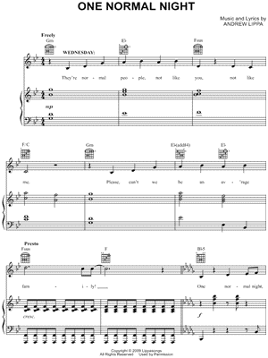 Browse our 2 arrangements of "One Normal Night." Sheet music is available for Piano, Guitar, 3-Part Choir and 5 others with 2 scorings in 2 genres. Find your perfect arrangement and access a variety of transpositions so you can print and play instantly, anywhere.