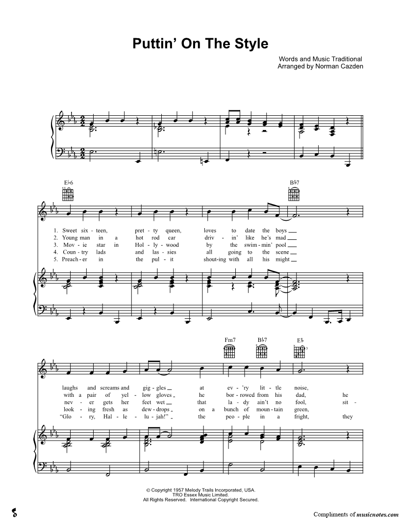 Sweet sixteen, pretty queen, loves to date the boys laughs and screams and giggles at ev'ry little noise, turns her face a little, turns her head awhile, but we know she's only puttin' on the style. |