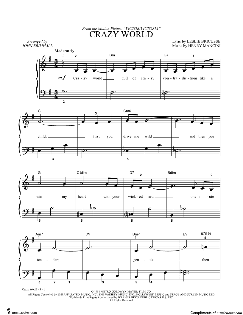 Crazy world full of crazy contradictions like a child; first you drive me wild and then you win my heart with your wicked art; one minute tender; gentle; then temp'ramental as a summer storm. |